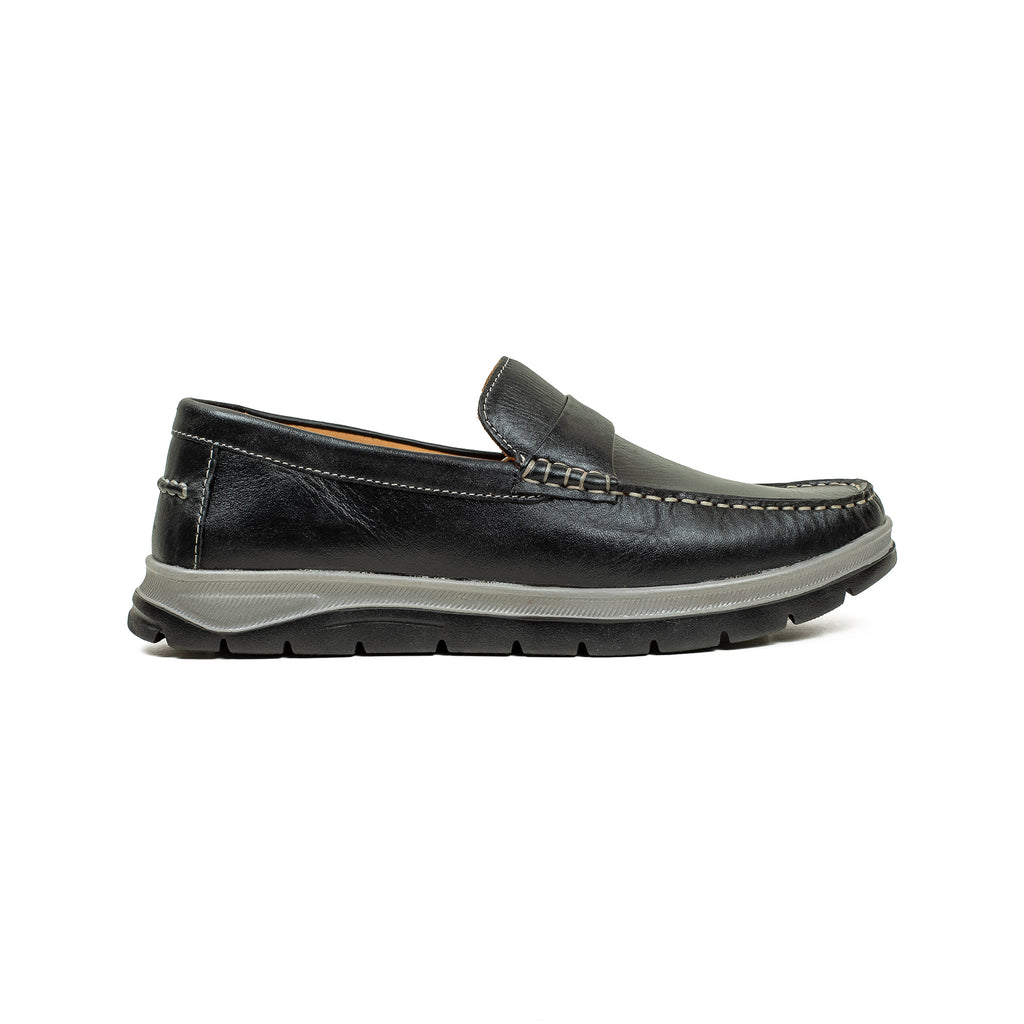 Treat your feet to the simple luxury and lasting comfort of this Rich black leather loafer. Designed with a sophisticated slip-on silhouette and accented by refined contrast stitching, this shoe seamlessly blends classic charm with modern practicality, making it an ideal choice for elevating your casual ensembles. Invest in this versatile and essential footwear to experience a touch of everyday luxury.