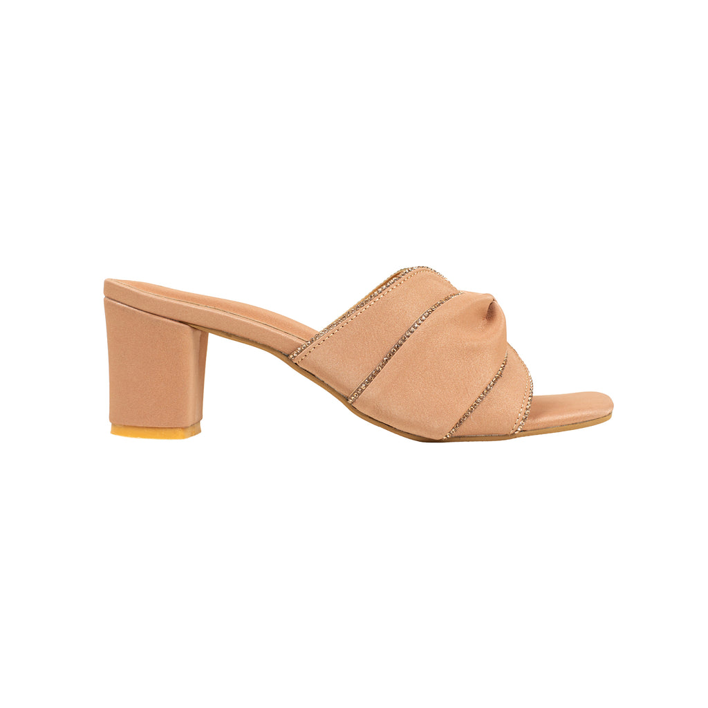 Step into timeless glamour with the Beige Stride Heeled Mules, crafted in a shimmering metallic grey satin finish. The elegant pleated knot design is elevated with rhinestone accents, making these mules the perfect blend of sophistication and sparkle. A sturdy block heel and cushioned insole ensure both comfort and style, whether for weddings, evening parties, or festive occasions.