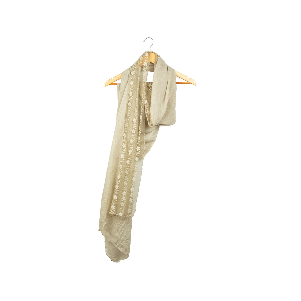 Embrace classic elegance with this beige scarf, a timeless accessory that adds a touch of sophistication to any outfit. Crafted from a soft, lightweight, and breathable Polyester fabric, this scarf is perfect for year-round wear. The standout feature is the delicate white floral embroidery that runs along one side, creating a beautiful and intricate contrast against the neutral background. This versatile piece can be draped as a shawl for a formal event, worn as a neck scarf for everyday style, or even tied to a handbag to elevate your accessories.