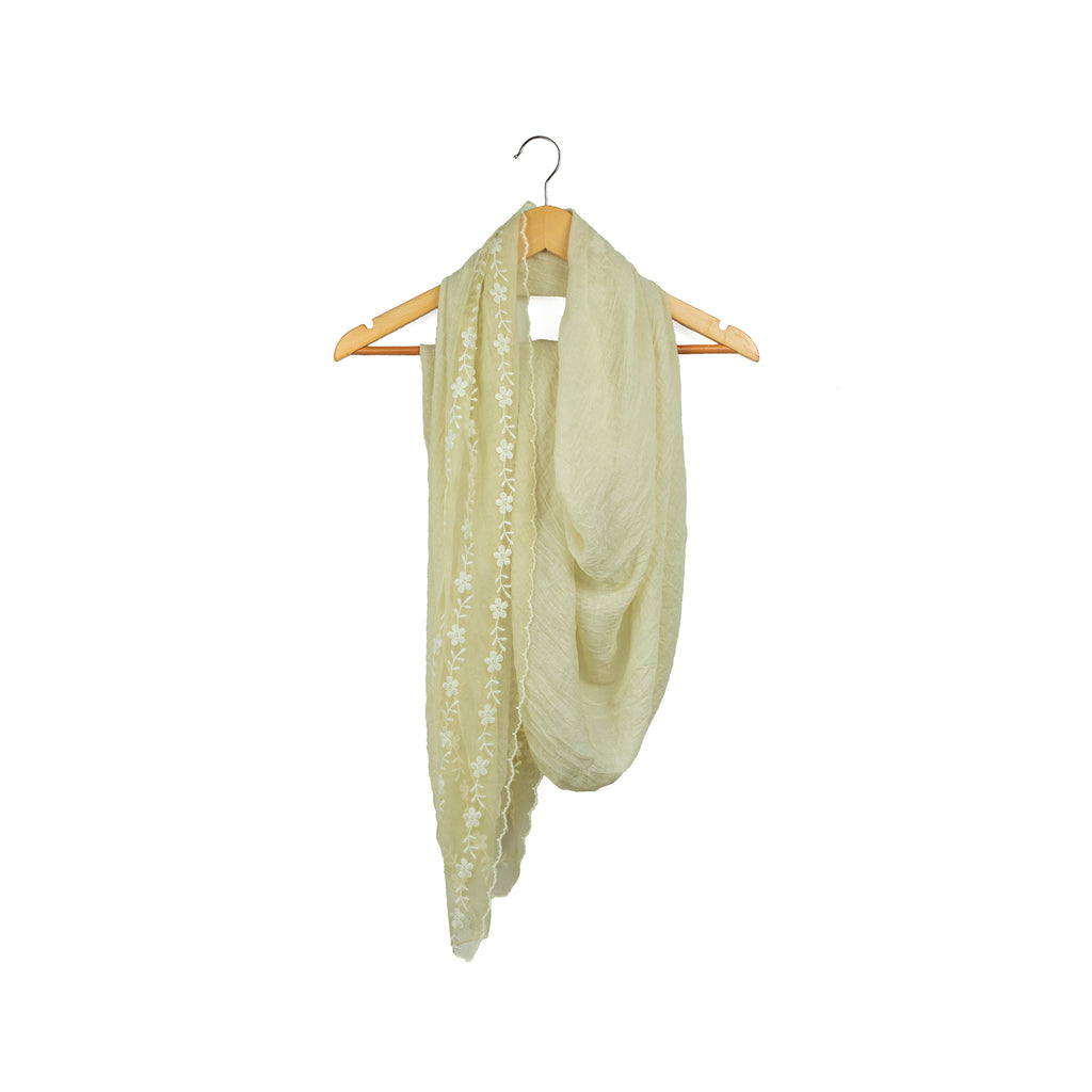 This elegant off-white scarf is a timeless addition to any wardrobe, blending subtle style with effortless comfort. Crafted from a soft, lightweight, and breathable Polyester fabric, it’s a perfect accessory for any season. The most striking detail is the delicate white floral embroidery that runs along one side, creating a beautifully intricate and feminine touch. Versatile and sophisticated, this scarf can be draped as a shawl for a formal event, wrapped around your neck for a classic look, or even tied to a handbag to add a graceful accent to your accessories.