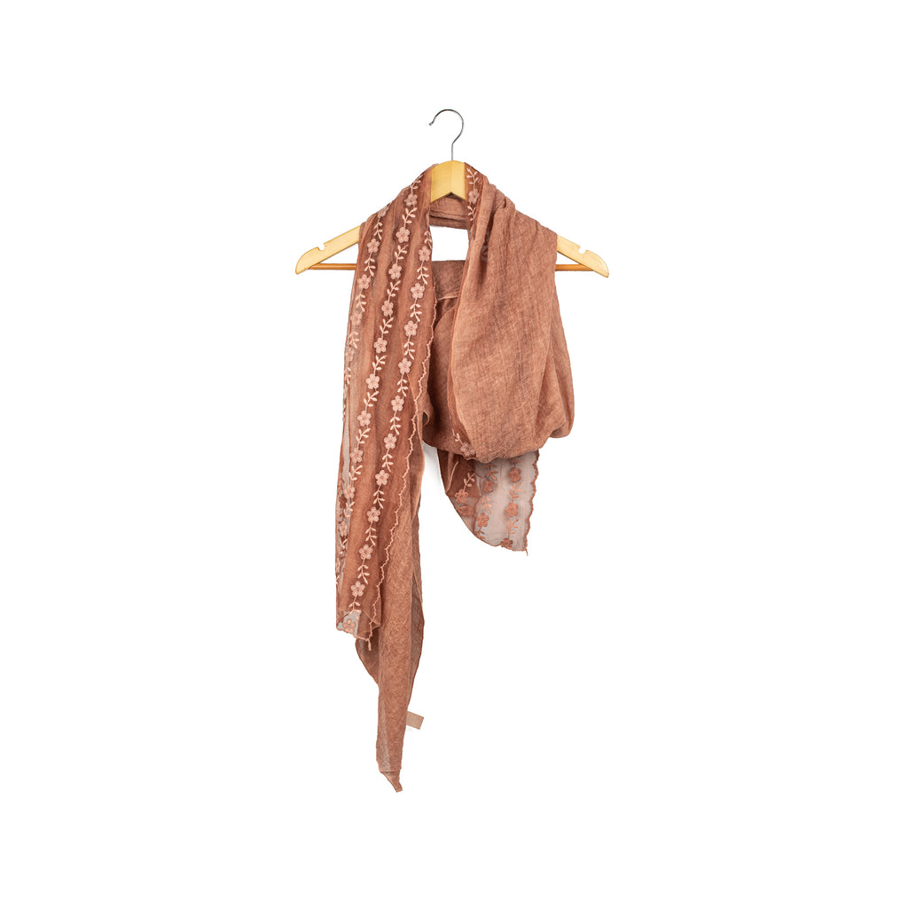 Add a touch of feminine charm to your collection with this elegant peach-toned scarf. Made from a soft, lightweight, and breathable Polyester fabric, it's the perfect accessory for year-round wear. The defining feature is the delicate white floral embroidery that runs along one side, adding a subtle yet beautiful contrast. This versatile piece can be styled in many ways—drape it over your shoulders as a shawl, wrap it around your neck for a classic look, or tie it to your handbag for a touch of grace.