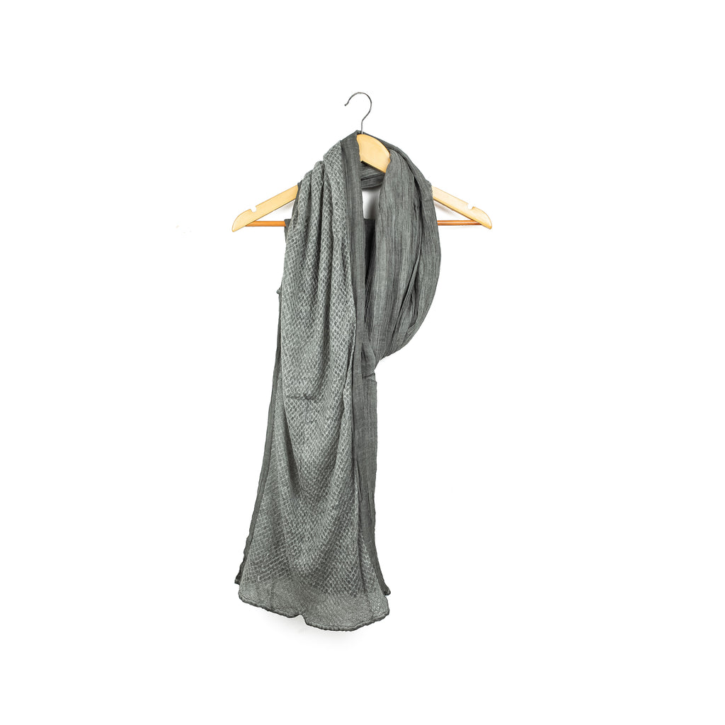 Wrap yourself in subtle sophistication with this charcoal-grey scarf. Made from a soft, lightweight fabric, it features a unique dual-tone design with a textured, dotted pattern on one half and a smooth, solid section on the other. This thoughtful combination adds visual interest and a modern twist to a classic accessory. Its neutral color and versatile style make it a go-to piece for any season. You can wear it as a neck scarf, drape it as a shoulder wrap, or tie it to your handbag for a touch of understated elegance.