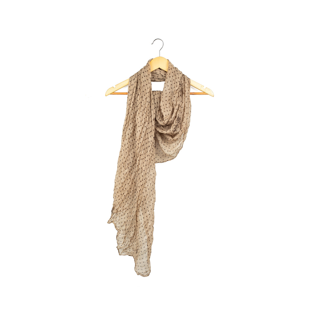 Add a touch of timeless charm to your wardrobe with this beautiful beige scarf. Made from a lightweight and breathable polyester fabric, it's designed for year-round comfort. The scarf features a delicate pattern of small black dots, adding subtle texture and a classic feel to any outfit. This versatile accessory can be draped as a shawl for a soft, elegant look or worn loosely around your neck for a casual, stylish feel.