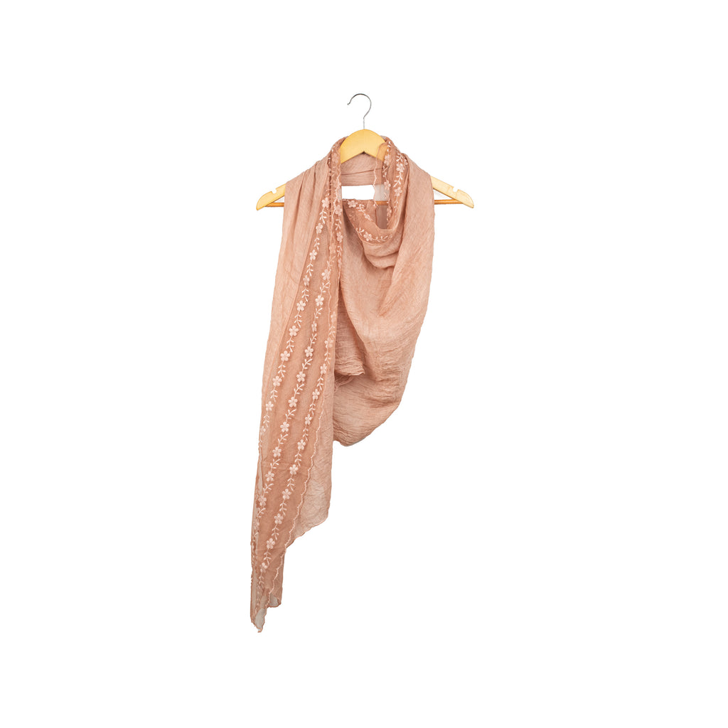 Add a touch of feminine charm to your collection with this elegant rust-colored scarf. Made from a soft, lightweight, and breathable polyester fabric, it's the perfect accessory for year-round wear. The defining feature is the delicate white floral embroidery that runs along one side, adding a subtle yet beautiful contrast. This versatile piece can be styled in many ways—drape it over your shoulders as a shawl, wrap it around your neck for a classic look, or tie it to your handbag for a touch of grace.