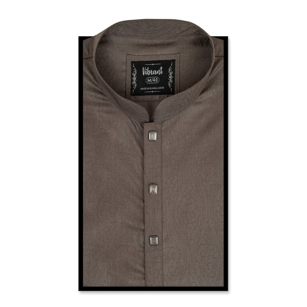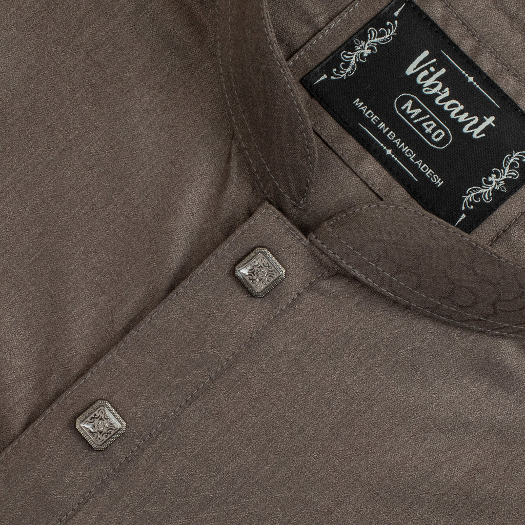 This Charcoal Brown Panjabi offers a clean and classic look for any occasion. Made from a comfortable blended cotton fabric, it features a subtle texture that adds a premium feel. The design is finished with unique metallic snap buttons and a traditional mandarin collar, making it perfect for both casual and formal wear.