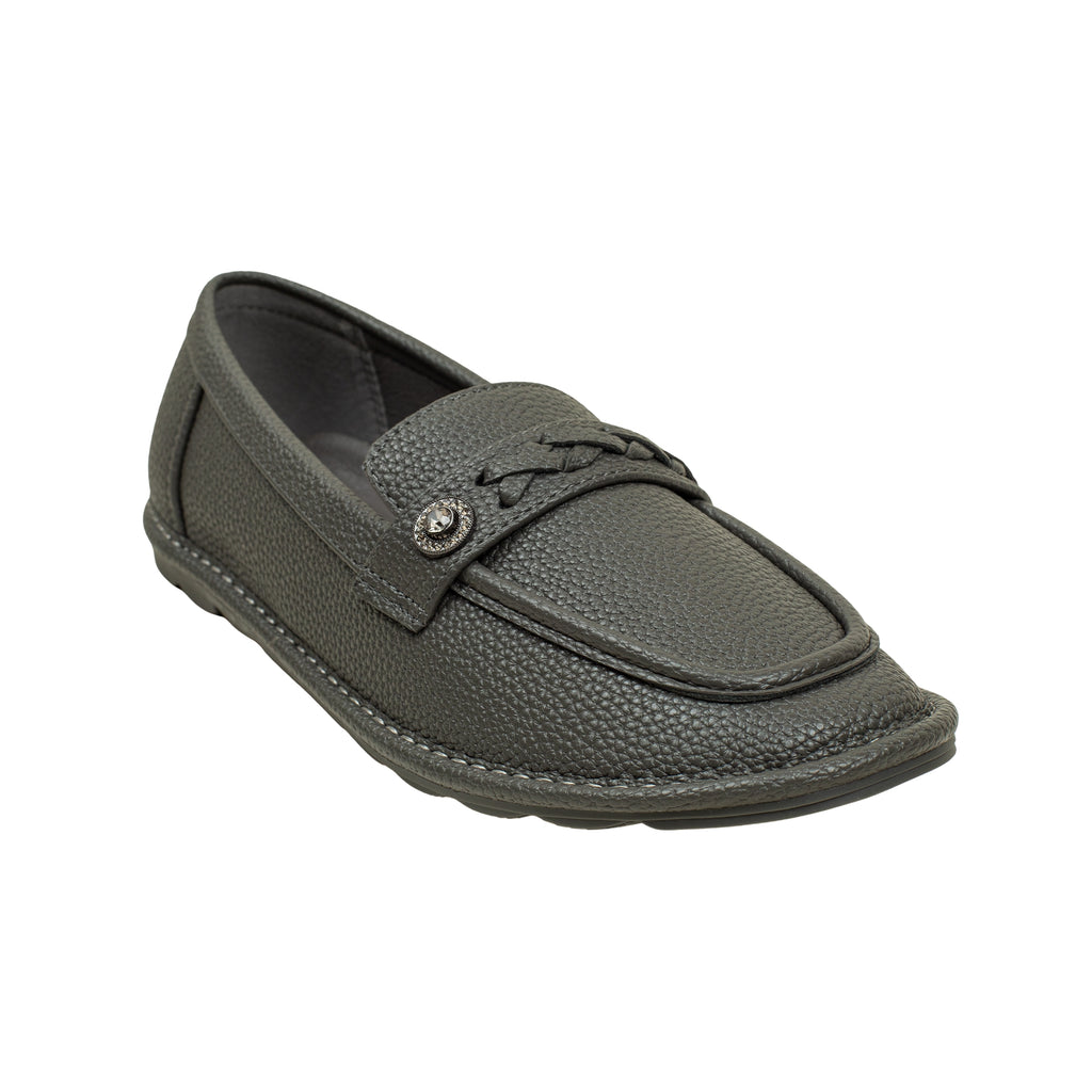 A sophisticated and formal Ladies' pump designed for business, office wear, or semi-formal events. Crafted in a rich grey shade, this shoe features a sleek pointed toe and a bold, geometric block heel with a high-shine finish, conveying both elegance and modern style.