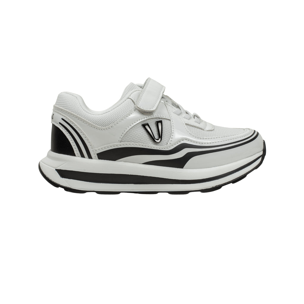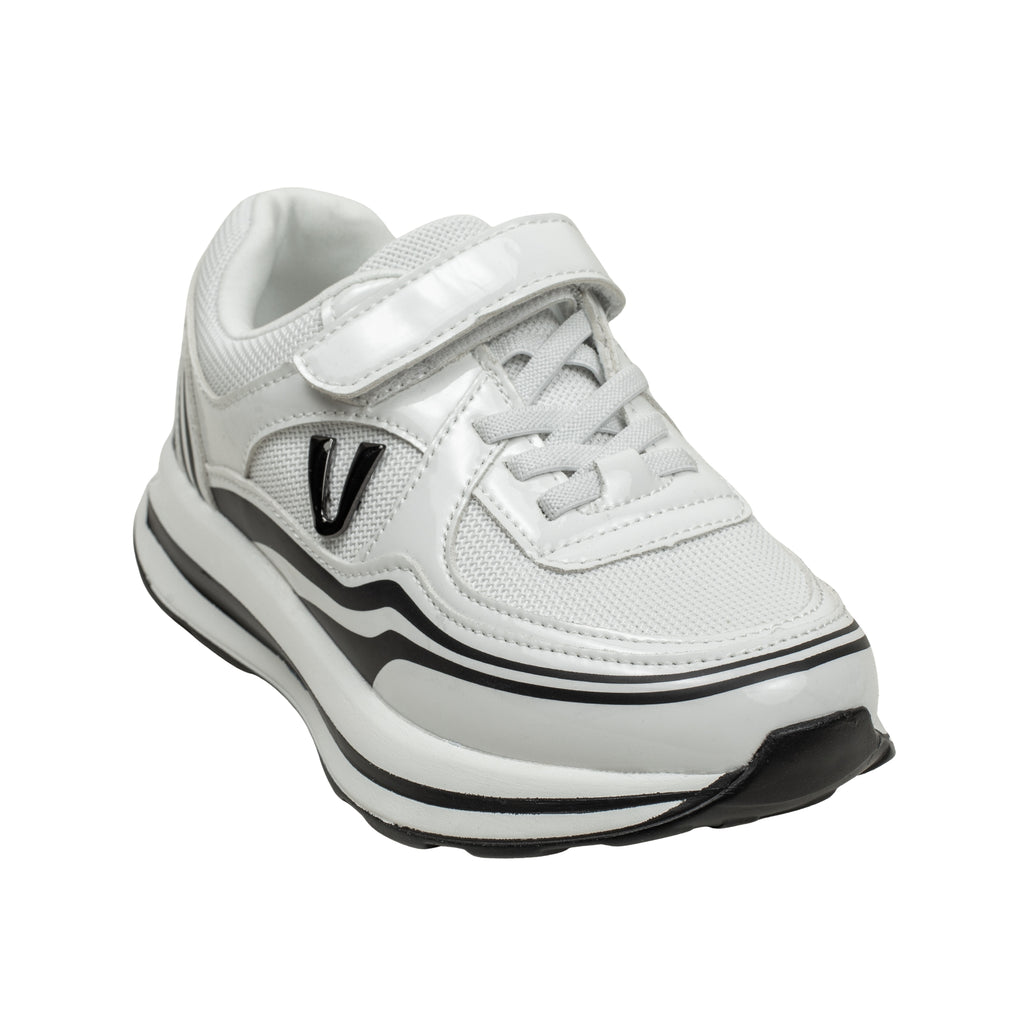Designed for the modern, active child, the V-Velocity "Flash" merges futuristic street style with practical daily comfort. This sneaker features a high-contrast monochrome palette, utilizing glossy overlays and wave-inspired graphic lines to create a sense of speed and movement. The combination of a secure strap and technical mesh makes it the perfect choice for kids who want a "big kid" look with easy-to-wear functionality.