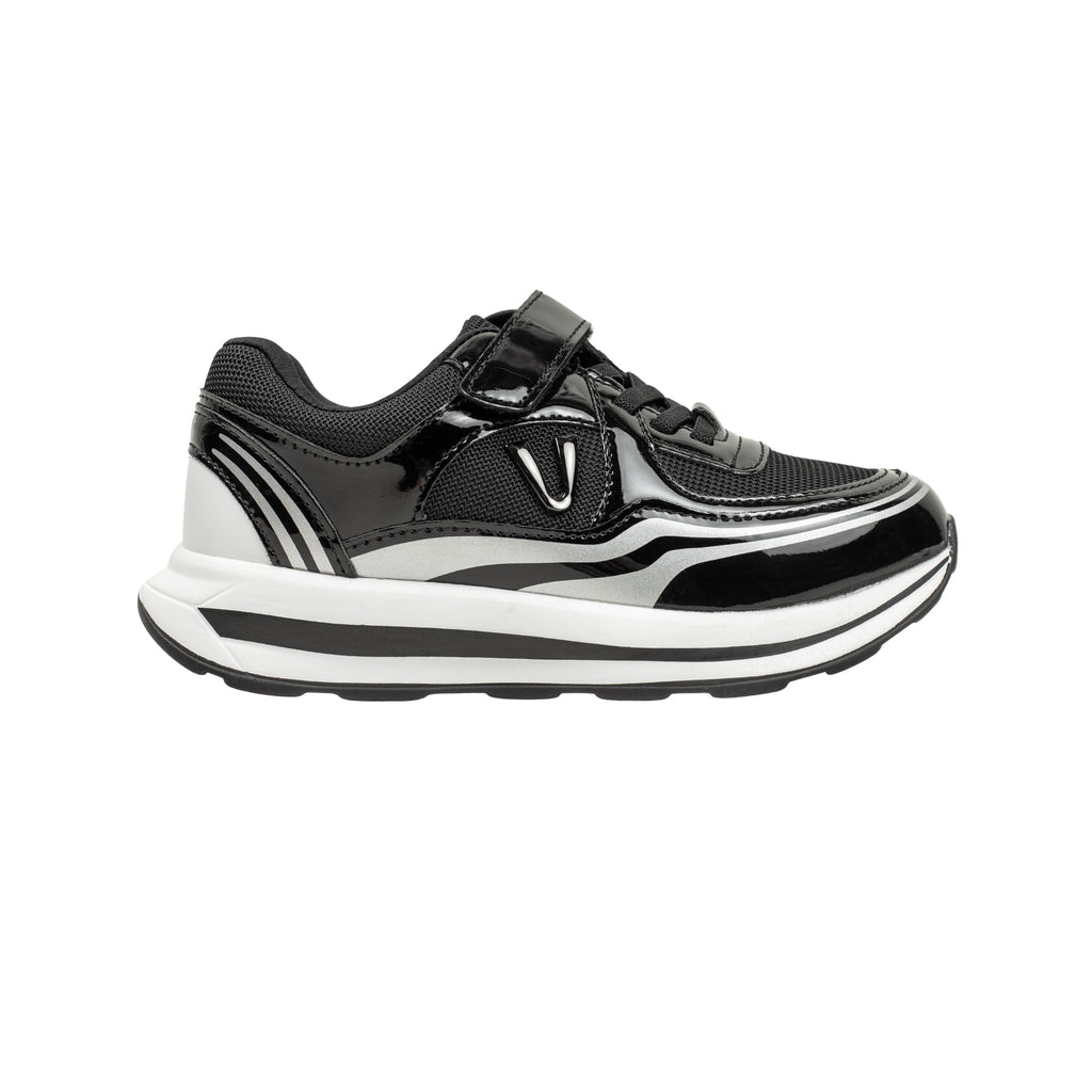 Designed for the modern, active child, the V-Velocity "Flash" merges futuristic street style with practical daily comfort. This sneaker features a high-contrast monochrome palette, utilizing glossy overlays and wave-inspired graphic lines to create a sense of speed and movement. The combination of a secure strap and technical mesh makes it the perfect choice for kids who want a "big kid" look with easy-to-wear functionality.