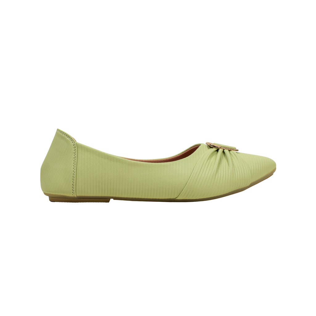 Step into effortless elegance with these sophisticated ladies' ballet flats. Designed for the modern woman who refuses to sacrifice comfort for style, these shoes feature a unique lime-green pastel hue and a chic textured finish. The elegant ruched detailing at the toe is cinched by a delicate gold-tone metallic ornament, adding a touch of luxury to your daily ensemble.