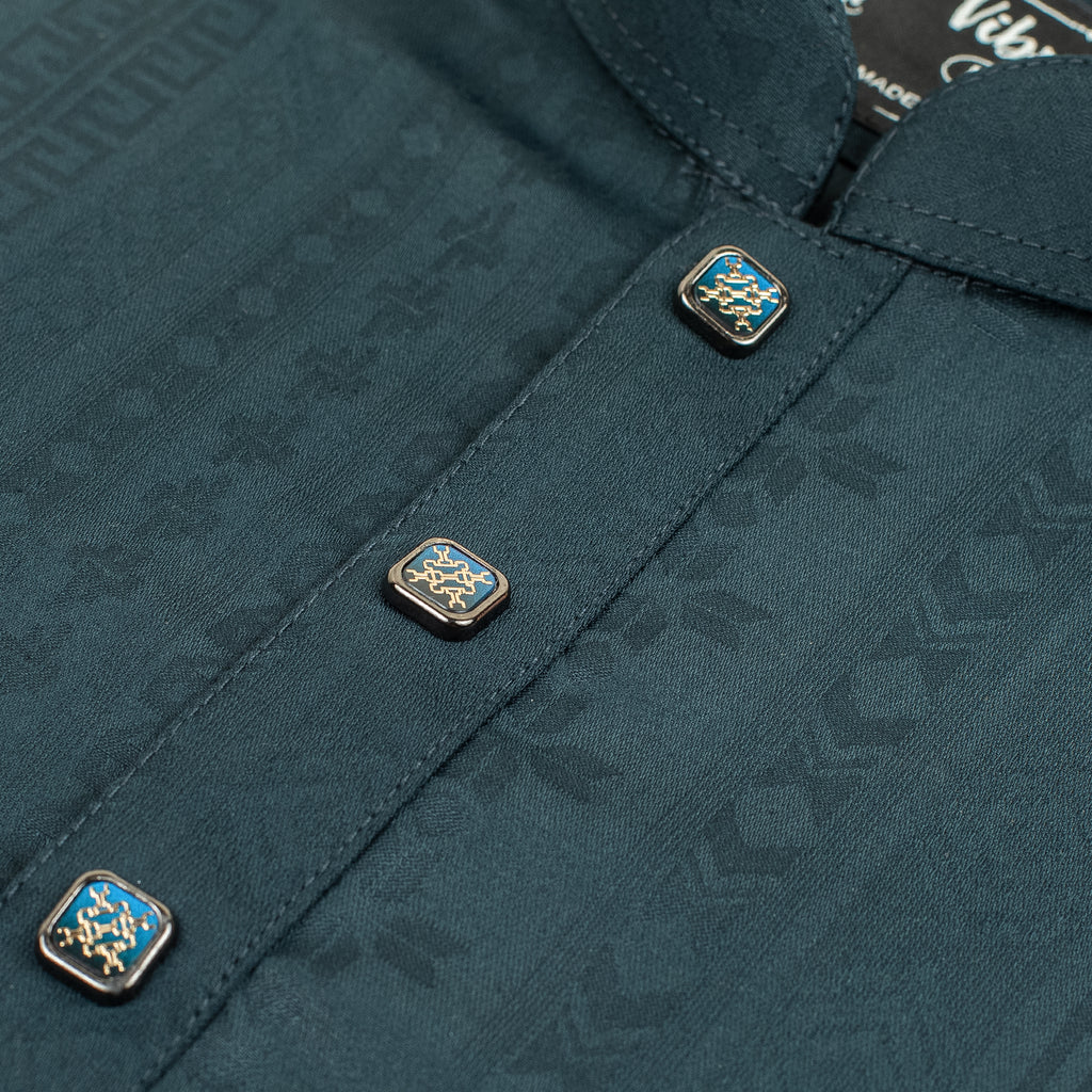 This Teal Blue Panjabi features a striking vertical jacquard print that adds height and structure to your look. Made from a durable cotton blend, it is designed to keep you comfortable while looking your best. The decorative snap buttons provide a high-end finish, making it perfect for festive celebrations.